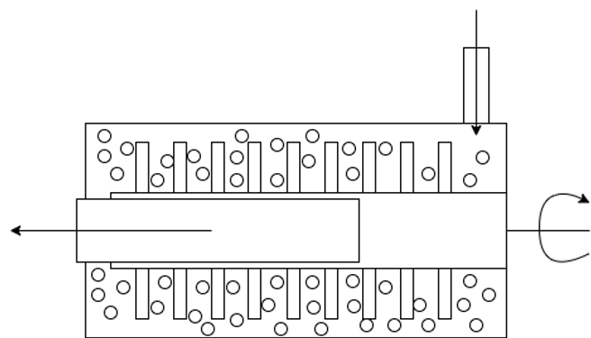 In this example, product enters from the top right and is pushed down the chamber to the left smashing into beads that are agitated by the central rotating agitator in turn breaking down the product into smaller particles. The product is filtered on the outlet allowing product through into the tank without letting beads out from the chamber.