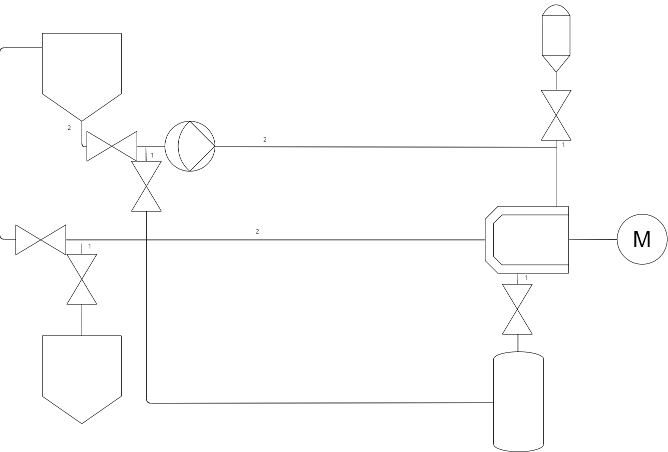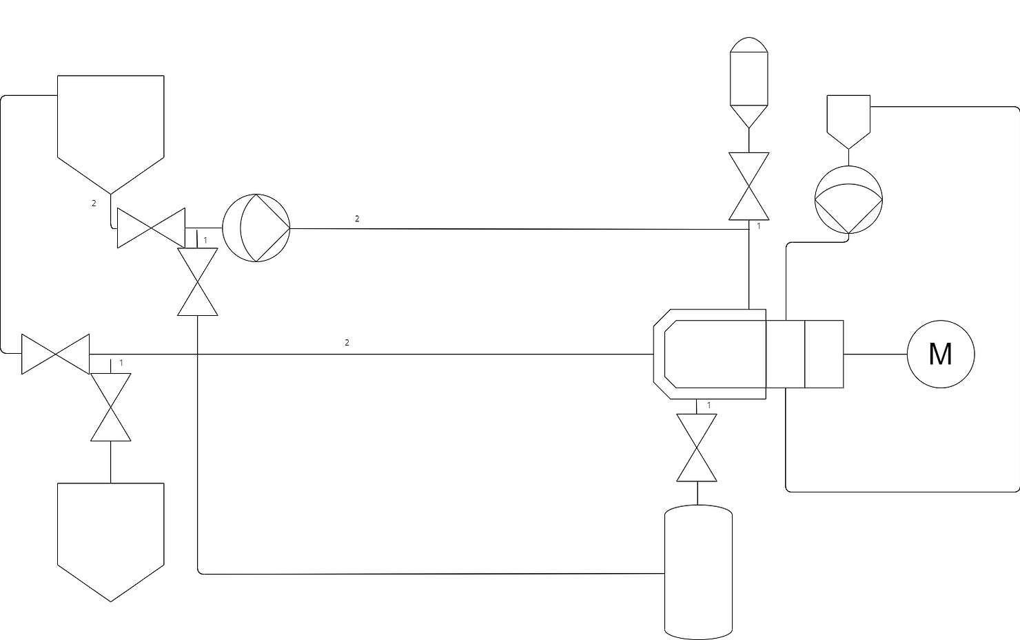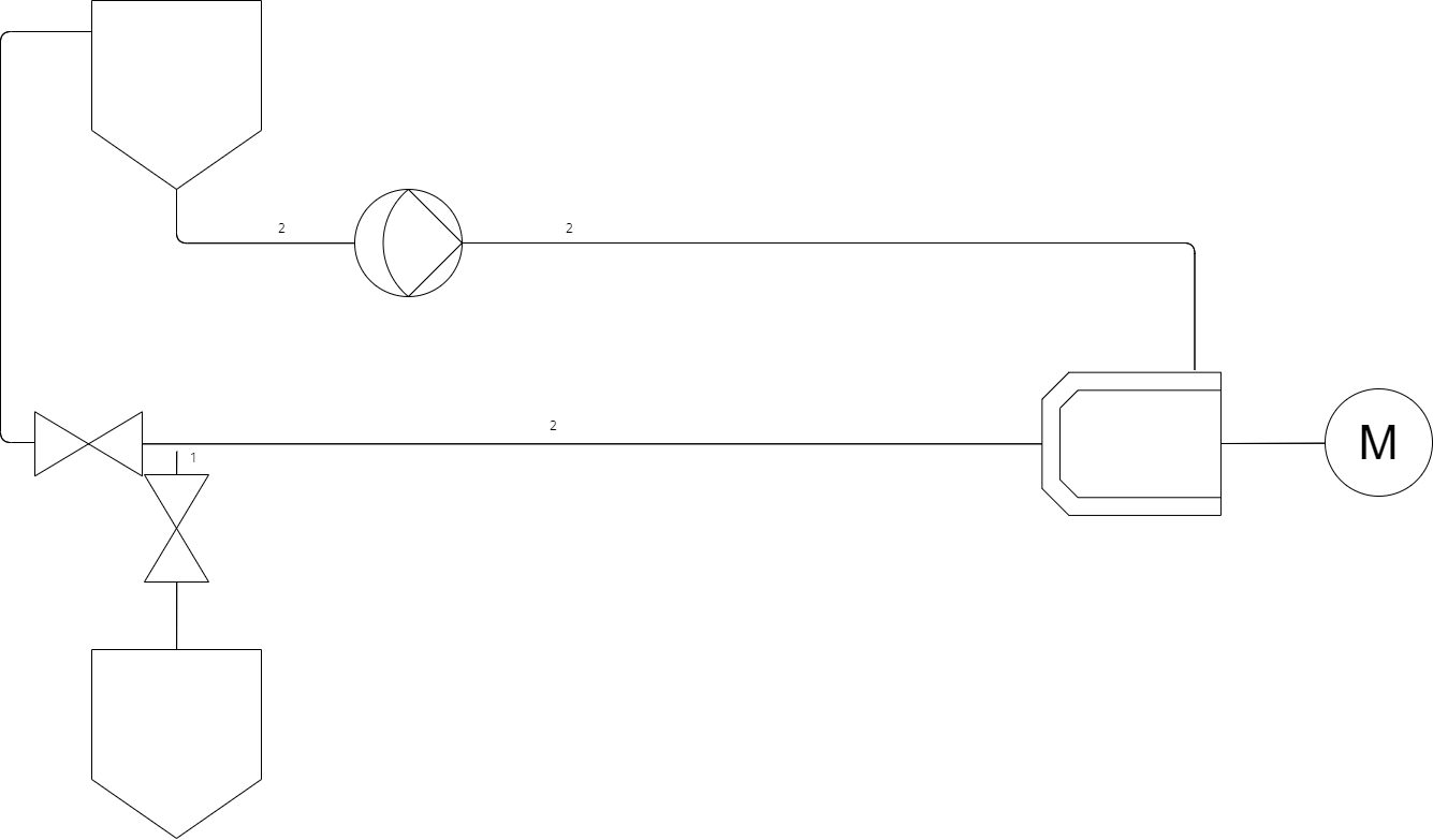 As seen above the second tank can be used to store completed product at the end of a milling cycle. I would like to draw attention to the pipe marked 1, this section of pipe is a dead leg in the recirculation loop whilst milling, as such product can sit uncirculated through the milling process as well as leave a cavity for bacteria, as such it is imperative to the design of a sterile mill to keep deadlegs as small as possible by mounting the deadleg valve as close as possible to the product loop. On the other hand it is also key that product naturally drains out of the loop as such to get the most return out of the loop as well as being key down the line for CIP/SIP drainability.